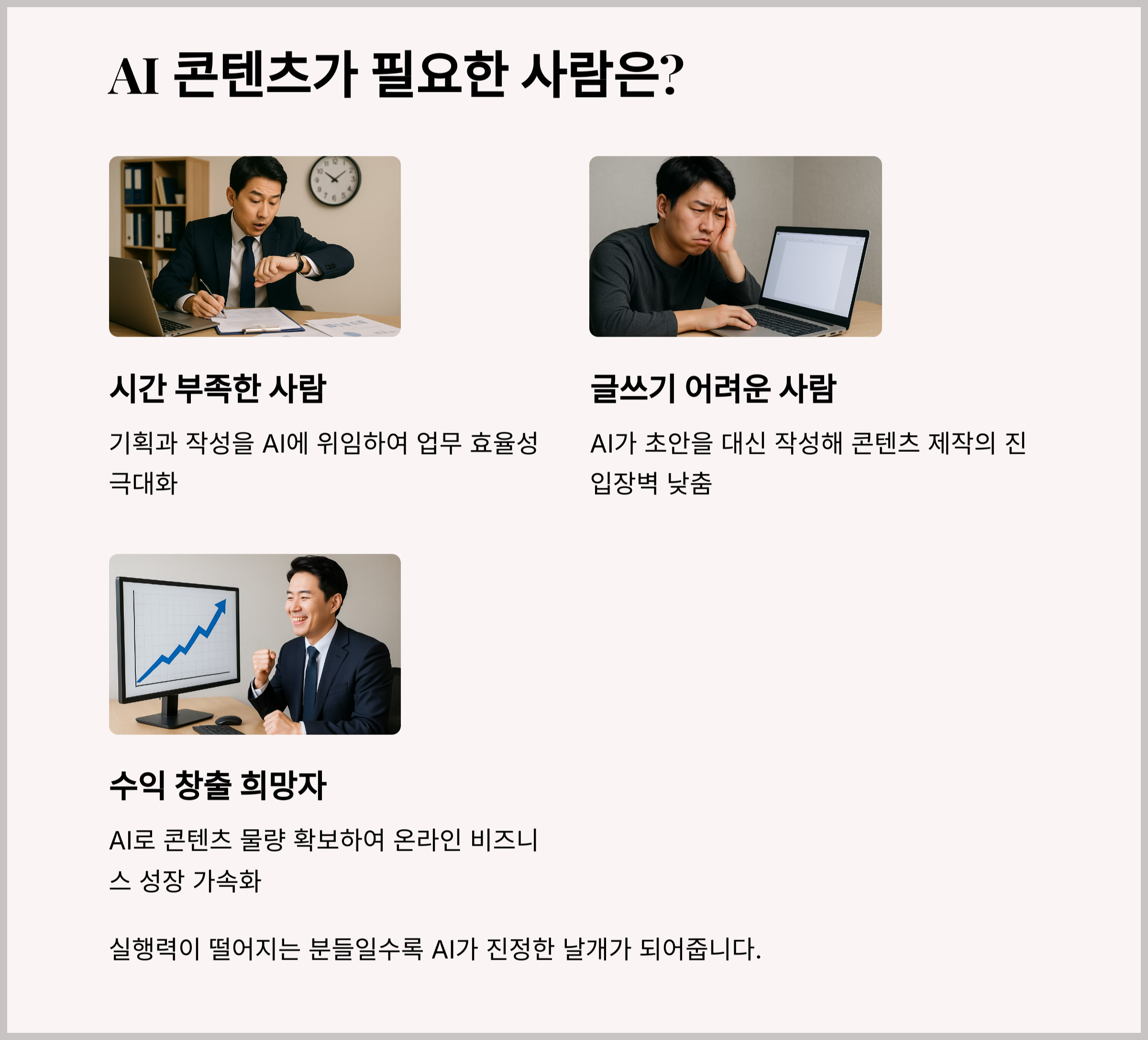 - "시간이 없지만 글은 써야 해" → 기획과 작성을 AI에 위임