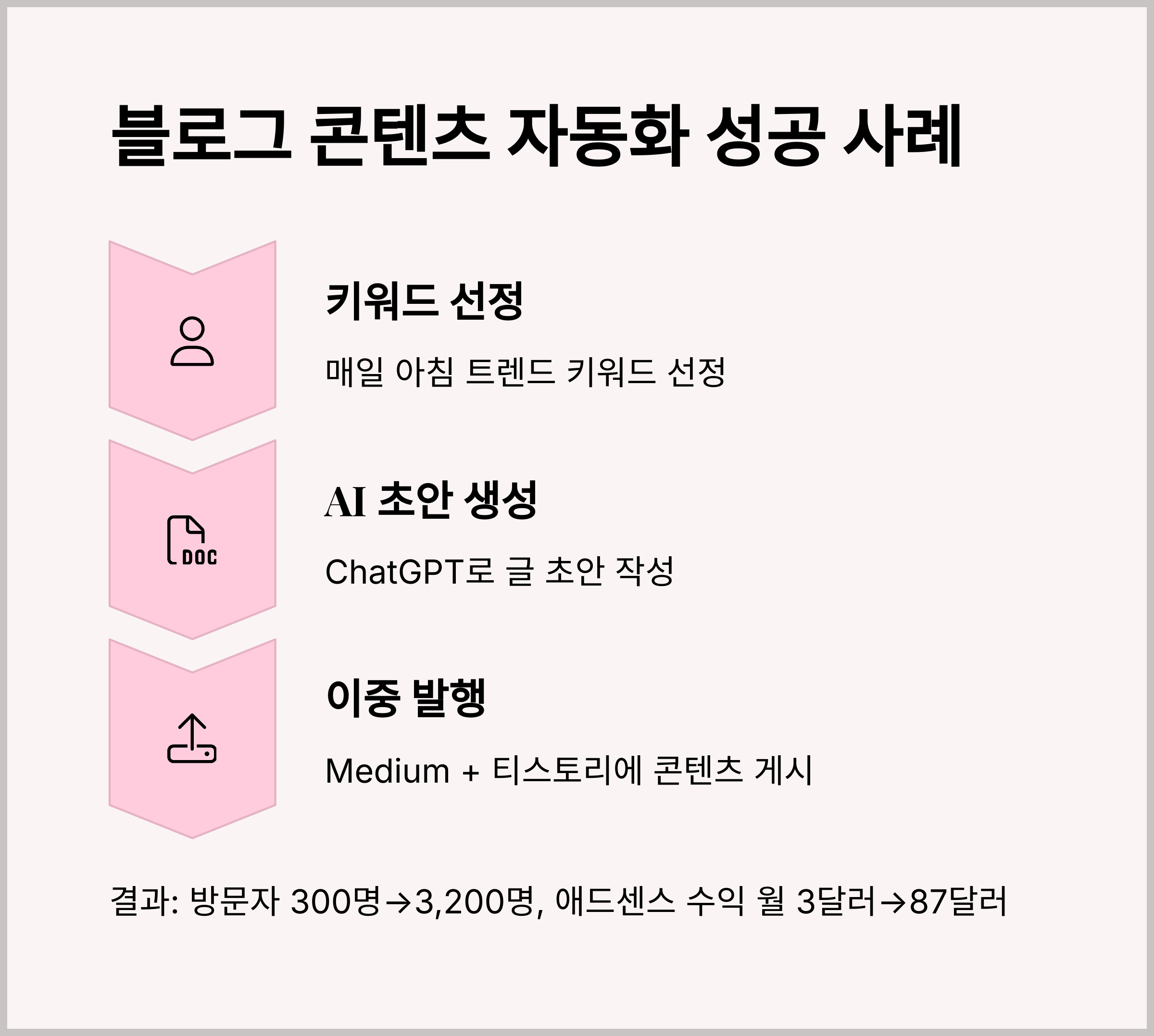 - 매일 아침 키워드 선정 → ChatGPT로 글 초안 생성